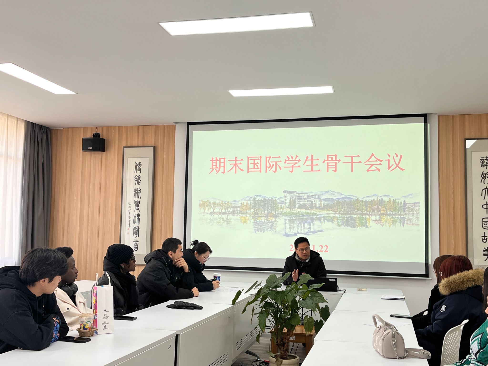 近日,国教学院召开2025学年秋季学期末国际学生骨干会议,旨在总结学期工作、研判当前形势、部署寒假期间及下一阶段重点任务。副院长钱潮主持会议,全体辅导员、班干部、学生会负责人等参加。