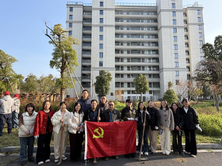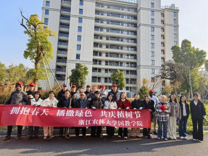 春风又绿江南岸,植树添绿正当时。为迎接我国第48个植树节,以实际行动践行绿色发展理念,3月12日下午,国教学院直属党支部组织全院党员教师与来自多个国家的留学生志愿者,齐聚平山学生公寓,开展“拥抱春天 播撒绿色 共庆植树节”主题党员活动,以实际行动为校园添绿增彩。