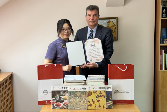 陈秀与图书馆馆长亚历山大·约卡诺维奇(Aleksandar Jokanović)共同回顾了双方十余年的合作成果。亚历山大感谢诺大孔院长期为当地居民提供中文优质课程教学和文化活动,认为图书馆已然成为该市汉语教学的重要基地之一,为市民学习中文、了解中国文化发挥了积极作用。这次捐赠的图书丰富了该馆中文书籍的馆藏,更有助于广大市民对中国文化的深入了解。